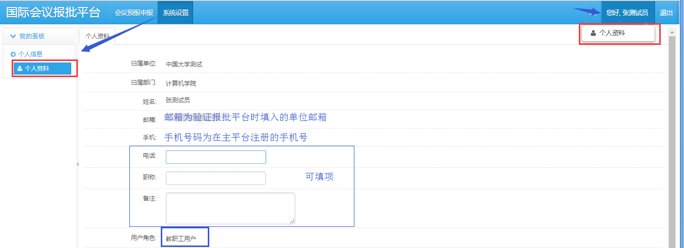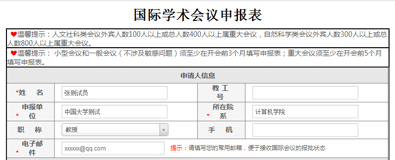 - 用户角色:教职工用户身份,具备提交会议预报和会议申报的权限。