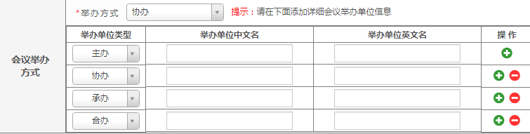 - 请选择贵单位的会议举办方式:主办、协办、承办、合办,并填写会议举办各单位的信息,可通过右侧