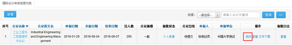 当会议的报批状态为“保存会议信息”、“个人申请”或“单位初审驳回”等时,用户可对会议申报信息进行修改和提交。