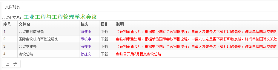 申请人在“文件下载”中下载会议申报信息表、国际会议校内审批流程表、会议安排表,提交所在校内二级单位党委负责人审核后,将校内流程表签字盖章扫描件发送oiec1@bnu.edu.cn 国际处邮箱。