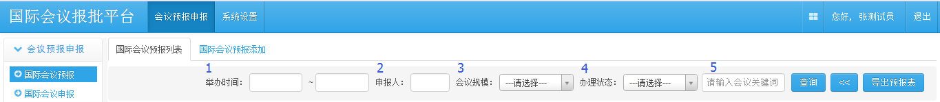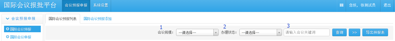 已预报的会议,从已通过的预报列表界面,点击“申报”按钮,开始填写申报信息。