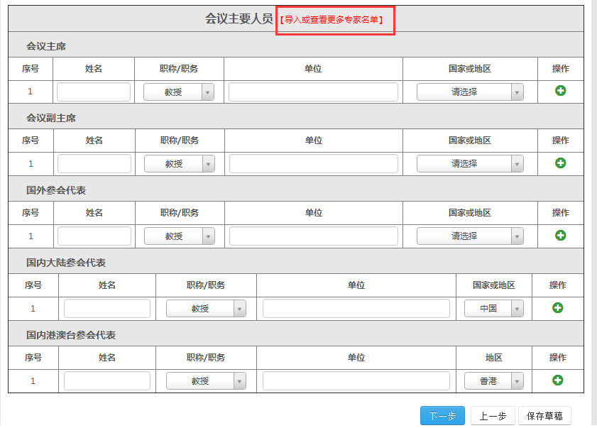 第二页为“会议主要人员”名单填写,请根据实际情况分别填写会议主席、会议副主席、国外参会代表、国内大陆参会代表、国内港澳台参会代表信息,可通过右侧![]()