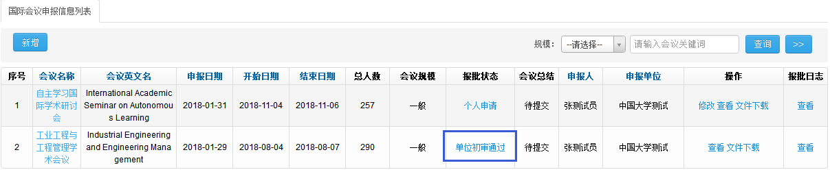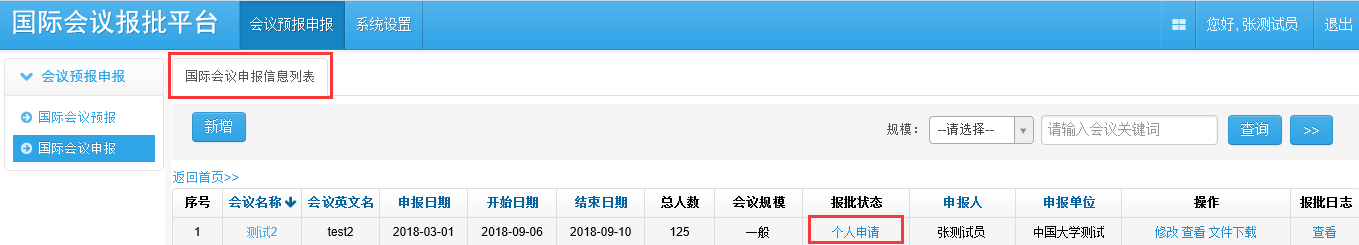 当添加会议申报完成后,自动跳转到国际会议申报信息列表界面,如下图所示。此条记录目前报批状态为“个人申请”。