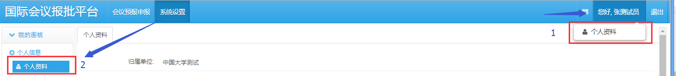 您可以点击右上角用户名或点击“系统设置”,以修改或查看个人信息。