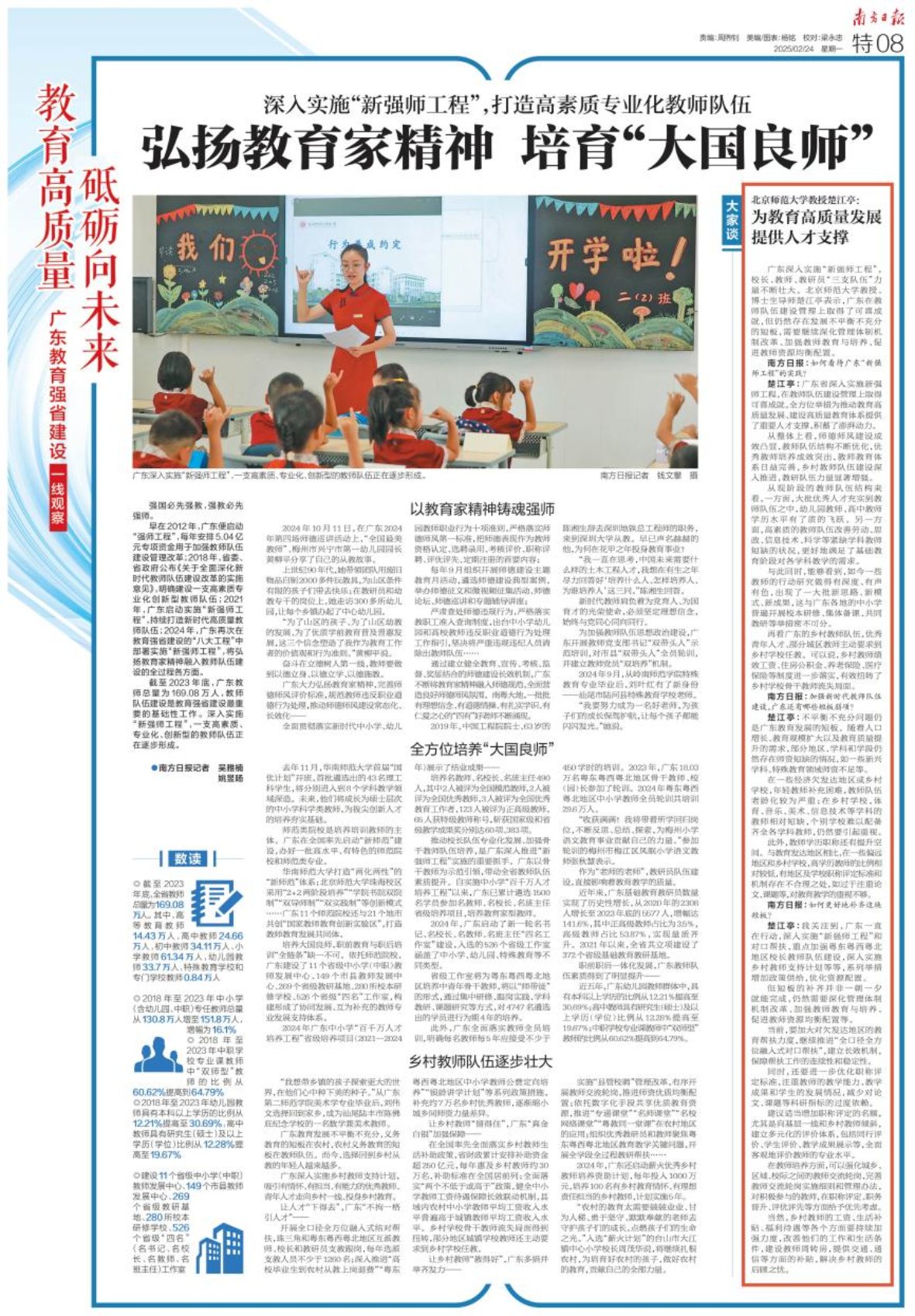 2月24日,全省教育大会在广州召开。会议召开之际,南方日报发表《教育高质量 砥砺向未来》特刊。在 《深入实施“新强师工程”,打造高素质专业化教师队伍——弘扬教育家精神 培育“大国良师”》一文中,北京师范大学未来教育学院教授楚江亭受邀在“大家谈”栏目中就“为教育高质量发展提供人才支撑”发表观点