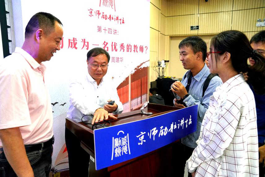 11月7日上午,京师励耘讲坛名师名校长系列第四讲在木铎楼A215举行。中国人民大学附属中学联合学校总校常务副校长、中学数学特级教师周建华博士以“如何成为一名优秀的教师”为题,结合自己的教学经历和现代教育理念给同学们带来了一场精彩的演讲。讲座由未来教育学院副院长孙波老师主持,杨明全老师、王琳明老师、陈星火老师和未来教育学院本科生、研究生等参加了此次讲座。