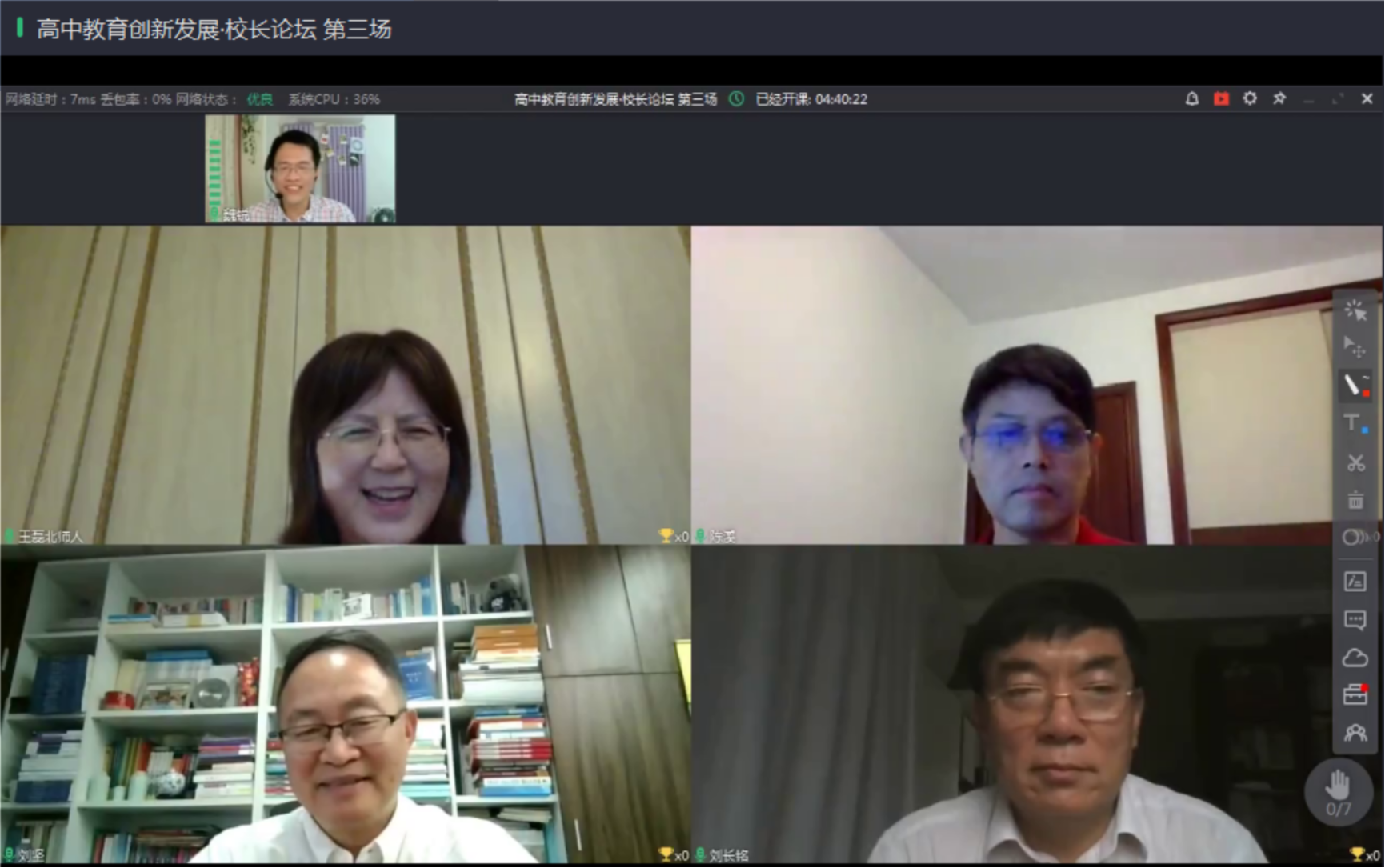 刘长铭校长和陈才锜校长分别作了题为“从人生看教育,从10-4→1——反思过去、面对现实、思考未来”和“普通高中全员育人导师制的实践探索”的专题报告,刘坚教授和王磊教授对嘉宾们的分享进行了深入交流和探讨。