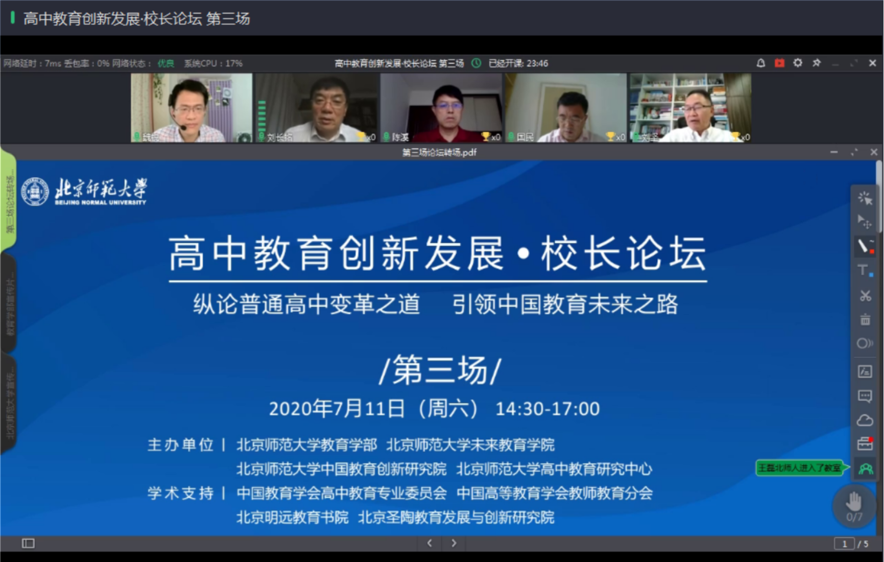为了推动高中教育高质量发展,7月11日,由北京师范大学教育学部、北京师范大学未来教育学院、北京师范大学中国教育创新研究院、北京师范大学高中教育研究中心等单位主办的“高中教育创新发展·校长论坛”第三场在ClassIn和抖音平台成功举办并面向全社会直播。