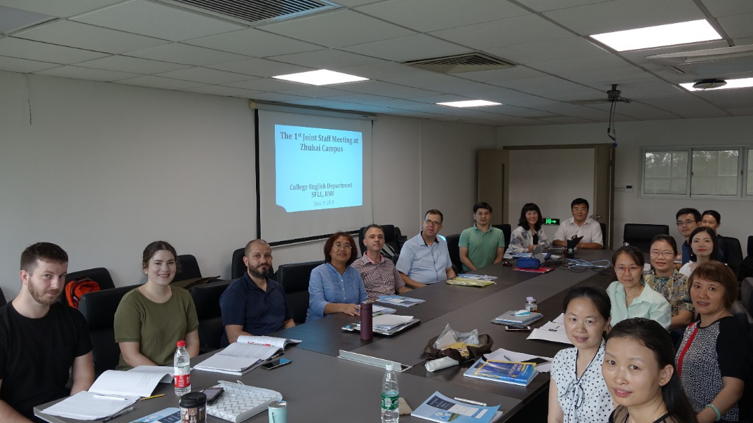 2019年9月5日,未来教育学院大学英语课程任课教师首次集体备课会,在珠海校区励教楼VB218会议室召开。全体中外任课教师共17人参加集体备课,北京师范大学外国语言文学学院副院长郭乙瑶教授、公外部主任林敦来老师全程参加研讨活动。