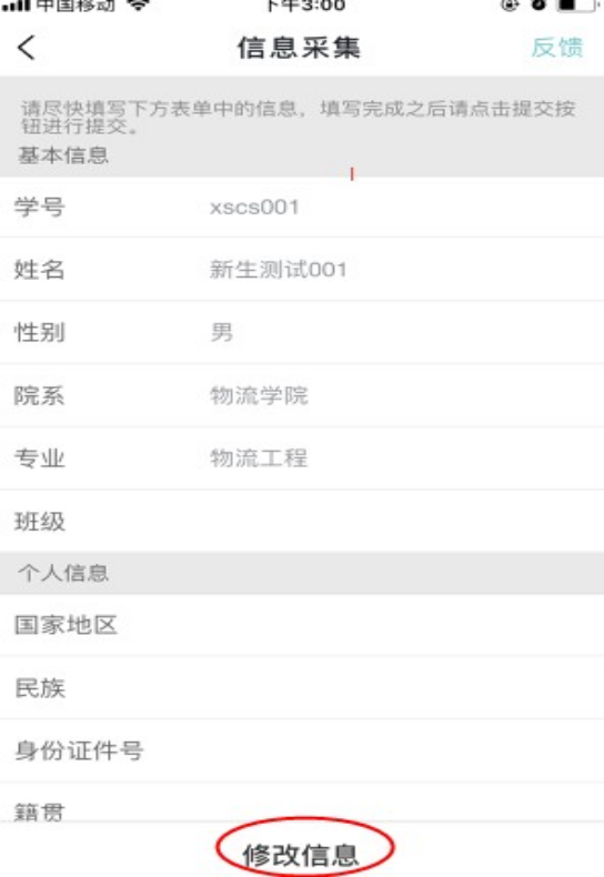 PC端登录系统进入迎新信息采集直接可以编辑信息提交,移动端登录系统进入迎新信息采集需要点击信息采集下方的修改信息按钮进行编辑。