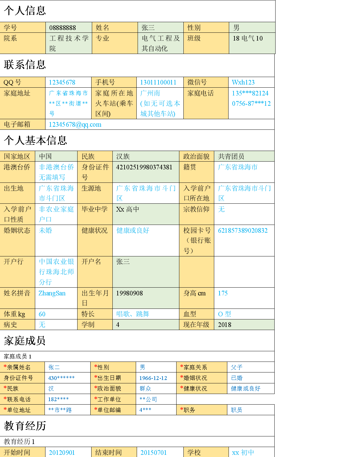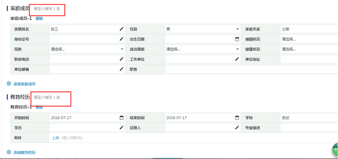 四. 家庭成员和教育经历至少各填写一条,否则无法提交。建议家庭成员写双亲,教育经历填写完整教育经历。