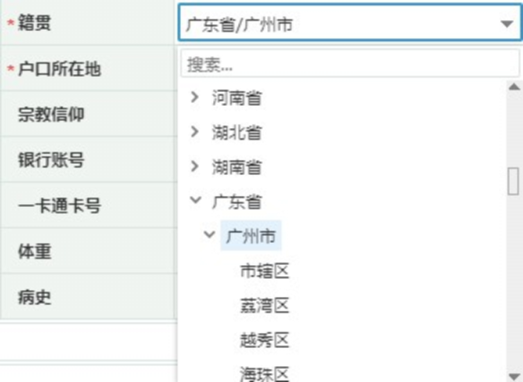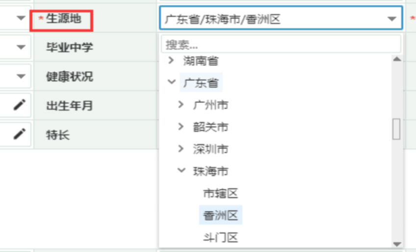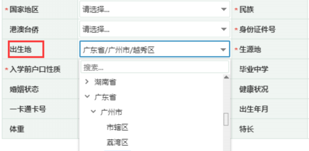 3. 出生地:根据下拉选择框精确到最后一级即可,例如广东省广州市越秀区