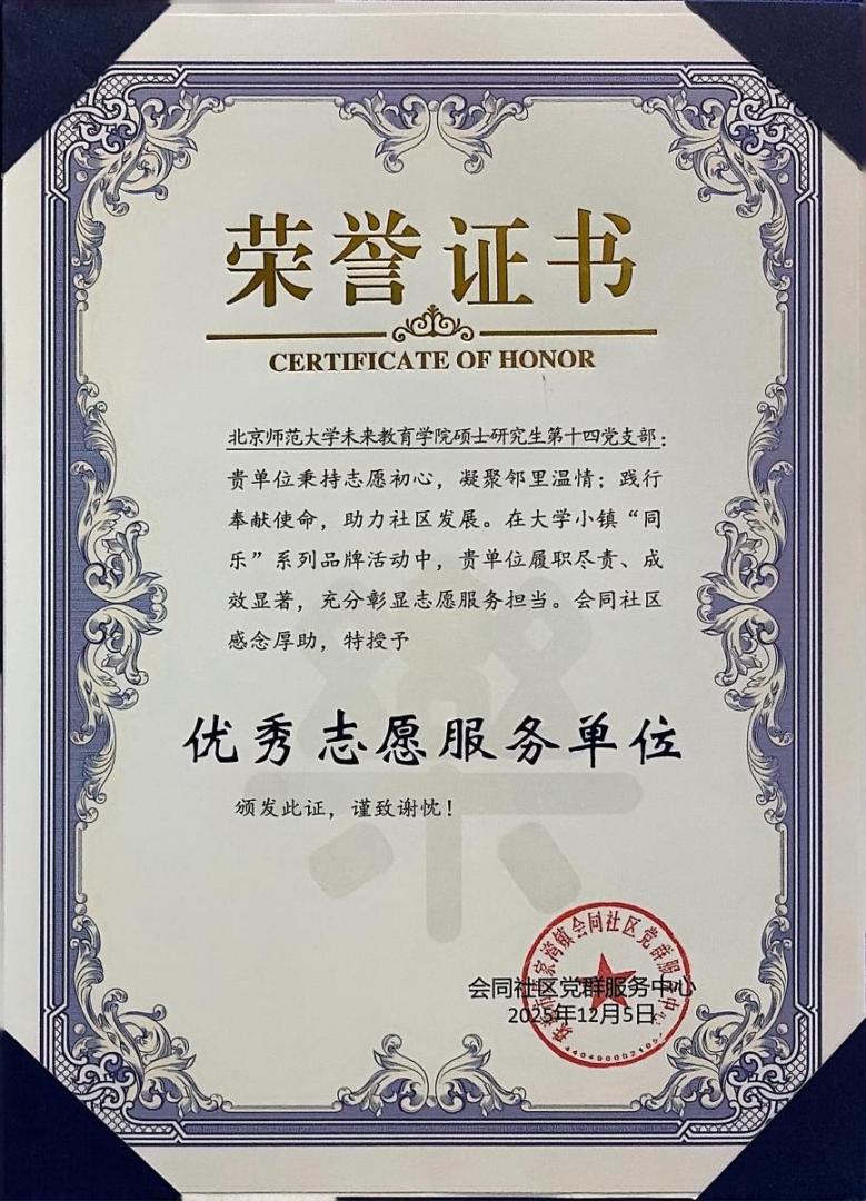 志愿者们的辛勤付出与真挚服务,不仅印刻在了老人们的笑容里,也获得了共建单位的高度赞誉。12月5日,正值第40个国际志愿者日,会同社区举办志愿服务表彰会,未来教育学院硕士研究生第十四党支部因在老年健身系列志愿服务活动中组织有力、成效显著,被授予“优秀志愿服务单位”荣誉称号;多名在活动中表现突出、甘于奉献的志愿者同学,荣获“优秀志愿者”荣誉称号。