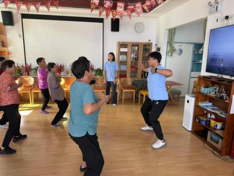 拍打操教学动作涵盖对于头部、肩部、背部、四肢等多个关键部位的轻拍与揉按,通过有节奏的拍打刺激穴位、促进血液循环,帮助老年人放松紧张肌肉、缓解身体疲劳。教学过程中,志愿者伴随着轻快的音乐带领大家练习,用通俗易懂的语言讲解拍打力度与重点部位,活动现场笑声与节拍声此起彼伏,充满活力。