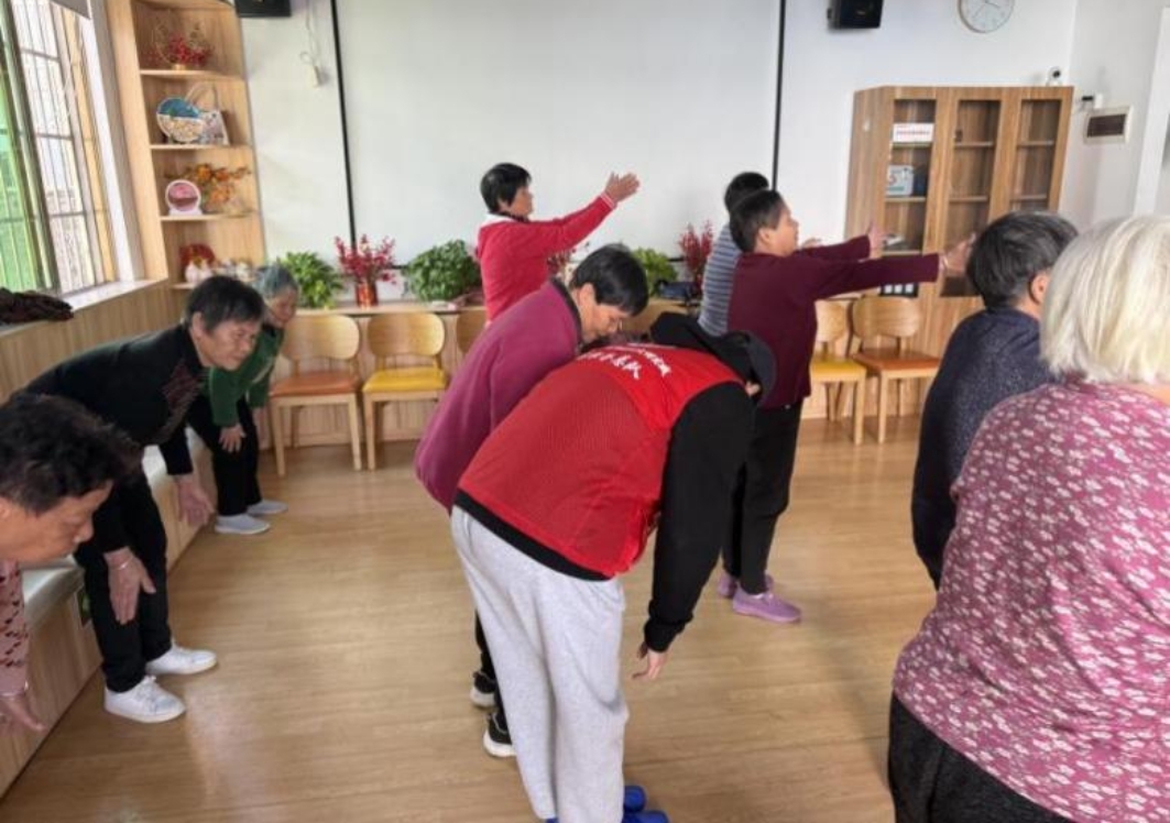 11月17日,志愿者在社区活动室带领老人开展了一场简化版八段锦教学。活动首先通过简单的关节活动和肌肉拉伸完成热身运动,然后以分解教学、慢速带练、个别辅导等方式,带领老人们从起势开始,逐步掌握了“双手托天理三焦”“左右开弓似射雕”等核心招式。老人们在一呼一吸、一招一式中舒缓身心调理气息,感受传统养生功法的魅力,现场学习氛围专注而融洽。