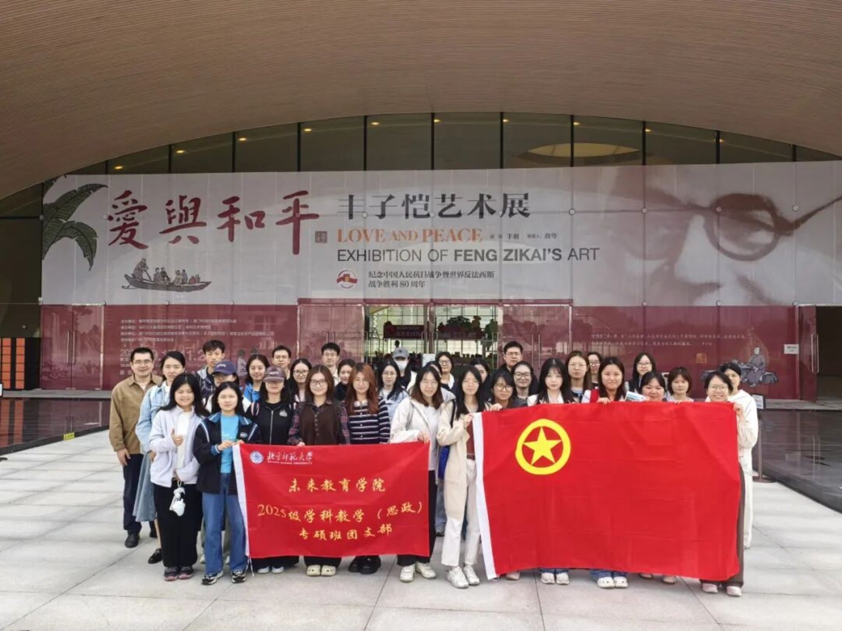 在横琴文化艺术中心,纪念中国人民抗日战争暨世界反法西斯战争胜利80周年丰子恺艺术展,为同学们带来了一场兼具审美与思想的文化熏陶。展览以 “家国之情”“诗意之韵”“童真之趣”“护生之心”四个板块,串联起丰子恺先生的经典作品。