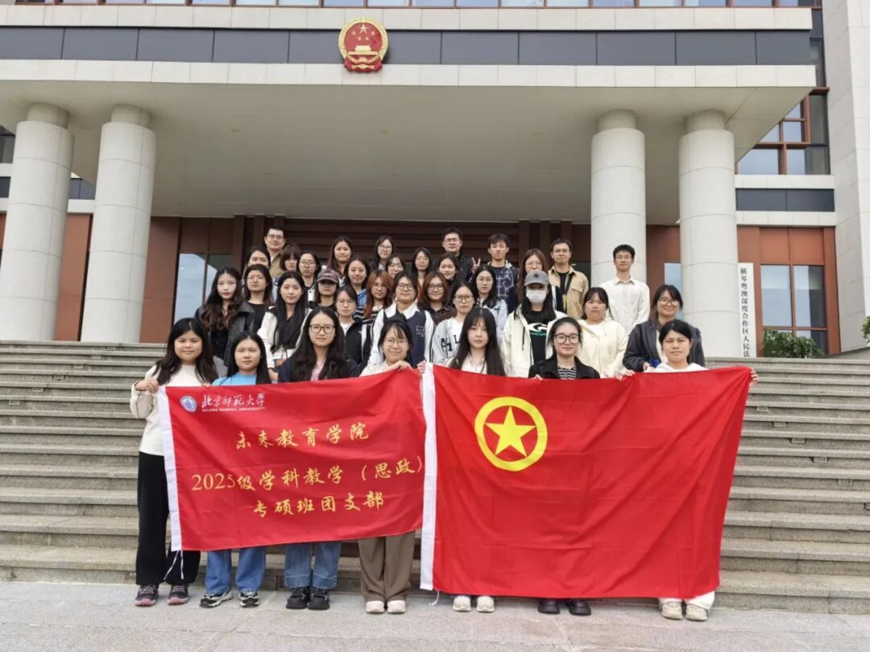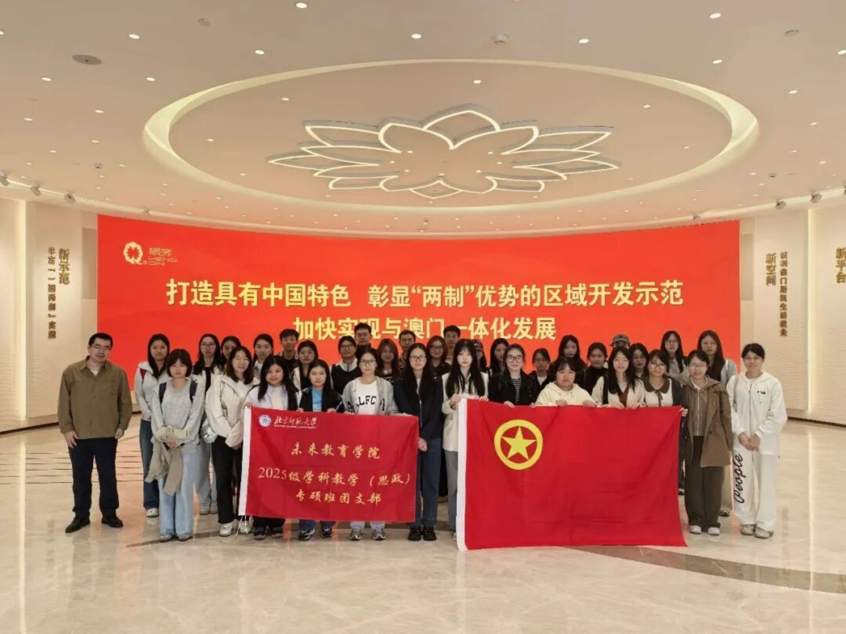 2025年11月14日,未来教育学院2025级学科教学(思政)专硕班全体同学在班主任袭亮老师的带领下,赴横琴粤澳深度合作区,开展了一场内容丰富、意义深远的实践教学与主题参访活动。从横琴展览馆到横琴文化艺术中心,再到横琴人民法院,一场沉浸式的“行走的思政课”,让同学们在实地观摩中深刻感悟国家战略的磅礴伟力与时代发展的强劲脉搏。