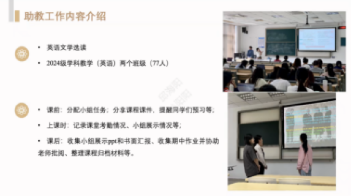 10位优秀助教结合自身工作经验与心得体会,针对不同学科课程的特点进行了经验分享,涉及备课、课堂管理、作业布置与批改、考试组织等多助教工作环节,涵盖课前准备、课中互动、课后辅导、突发事件及其解决、典型案例及个人感悟等多个方面,展现了扎实的工作作风和丰富的日常积累,更为今后的助教工作开展提供了借鉴与启示。优秀助教们纷纷表示,助教作为学生和任课教师之间沟通的桥梁,在辅助教学实施、提升课程质量方面扮演着重要角色。助教不仅需要深刻理解任课教师的教学目标与教学方式,提高教学辅助工作的精准性,还需要时刻关注学生的学习动态,及时捕捉并反馈学生的学习情况,助力任课教师优化教学策略,实现助“教”与助“学”的双重目标,提升教学实效性。