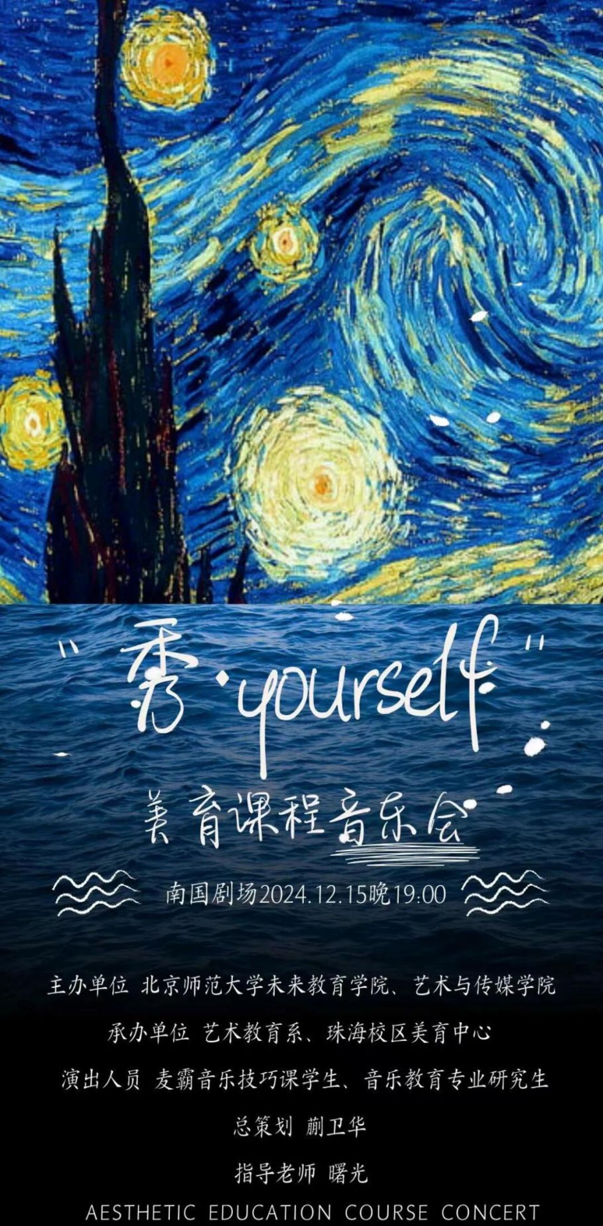 2024年12月15日19:00,由北京师范大学未来教育学院艺术教育系和珠海校区美育中心携手策划的美育课程音乐会“秀・yourself”在北京师范大学珠海校区南国剧场成功举办。