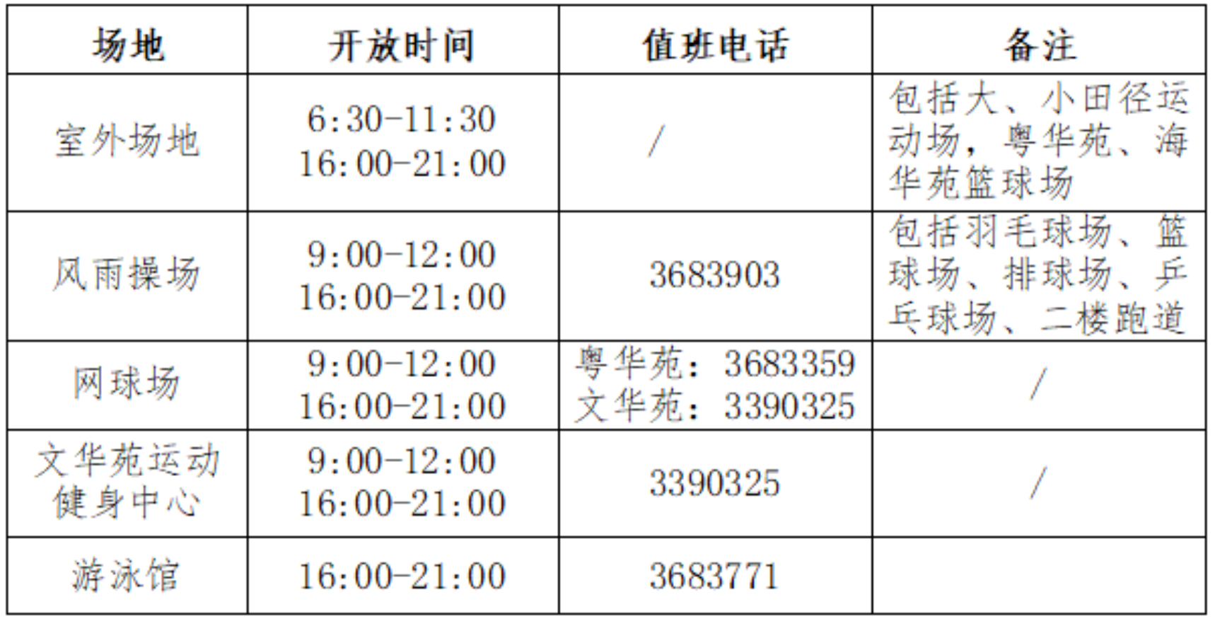 (1)风雨操场羽毛球、篮球场地、粤华苑和文华苑网球场地,需提前在场馆预定小程序中预约。