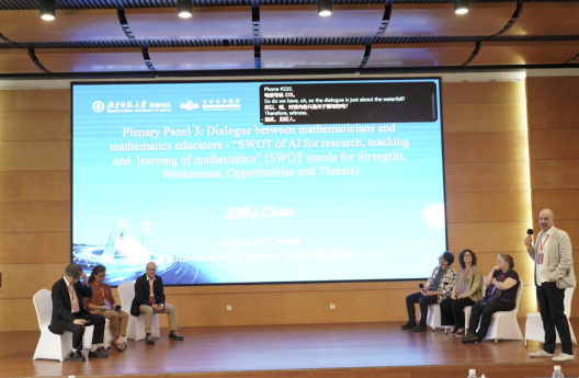 3月19日上午,论坛设置数学家与数学教育工作者对话环节,由ICMI秘书长Jean-Luc Dorier教授主持。国际著名数学家、菲尔兹奖获得者、国际数学联盟(IMU)主席、东京大学教授Hiraku Nakajima,国际数学联盟秘书长、南特大学Christoph Sorger教授,圣保罗大学Paolo Piccione教授与数学教育专家Betina Duarte教授、Cristina Sabena教授、Susanne Prediger教授齐聚一堂,围绕“人工智能在数学研究、教学与学习中的优势、不足、机遇与挑战”展开深入研讨,实现了数学研究与数学教育领域的跨界对话,为推动人工智能与数学教育深度融合拓展了新的研究视野。